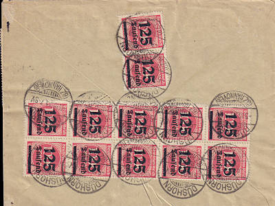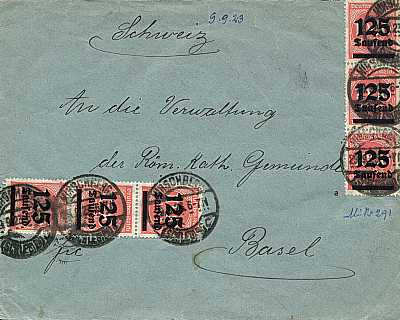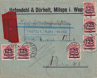 Inlandsbrief mit Eilzustellung (1-20 g) vom 28.09.1923 (18. Periode) frankiert mit 6 Marken a 125 000 Mark auf 1 000 Mark (=750 000 Mark, 250 000 Brief 500 000 Eilzustellung) |