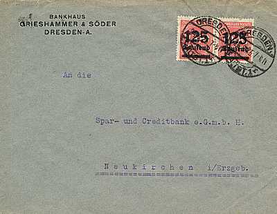 Inlandsbrief (1-20 g) vom 24.09.1923 (18. Periode) frankiert mit 2 Marken a 125 000 Mark auf 1 000 Mark (=250 000 Mark) |