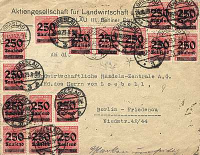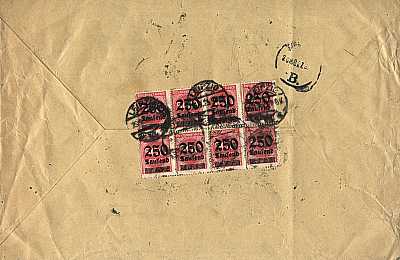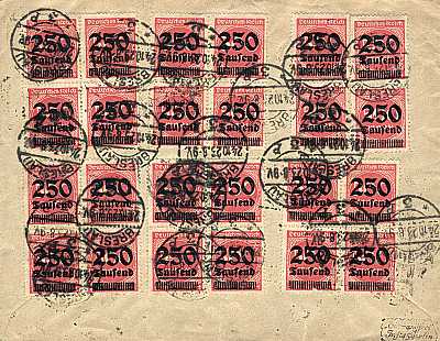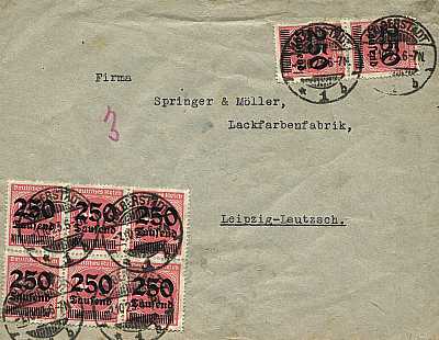 Inlandsbrief (1-20 g) vom 01.10.1923 (19. Periode) frankiert mit 8 Marken a 250 000 Mark auf 500 Mark (=2 Millionen Mark) |