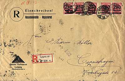 Inlandsbrief mit Einschreiben (1-20 g) vom 22.09.1923 (18. Periode) frankiert mit 2 Marken a 250 000 Mark auf 500 Mark (=500 000 Mark, 250 000 Brief 250 000 Einschreiben) |