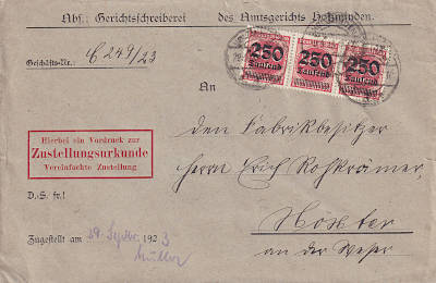 Inlandsbrief mit Zustellungsurkunde (1-20 g) vom 29.09.1923 (18. Periode) frankiert mit 3 Marken a 250 000 Mark auf 500 Mark (=750 000 Mark, 250 000 Brief 250 000 Zustellung 250 000 Urkunde) |