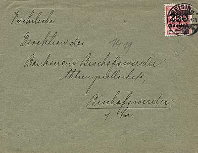 Inlandsbrief (1-20 g) vom 26.09.1923 (18. Periode) frankiert mit einer Marke a 250 000 Mark auf 500 Mark (=250 000 Mark) |