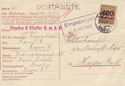 Ortspostkarte vom 05.10.1923 (19. Periode) frankiert mit einer Marke a 400 000 Mark auf 15 Pfennig (=400 000 Mark) |