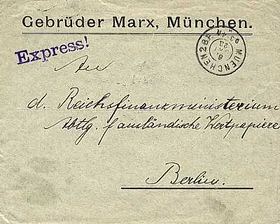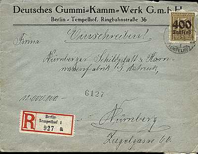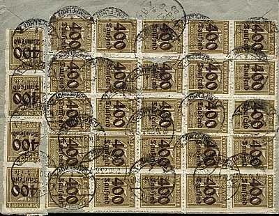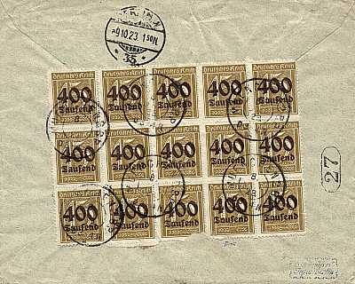 Inlandsbrief mit Eilzustellung (1-20 g) vom 08.10.1923 (19. Periode) frankiert mit 15 Marken a 400 000 Mark auf 15 Pfennig (=6 Millionen Mark, 2 Millionen Brief 4 Millionen Eilzustellung) |