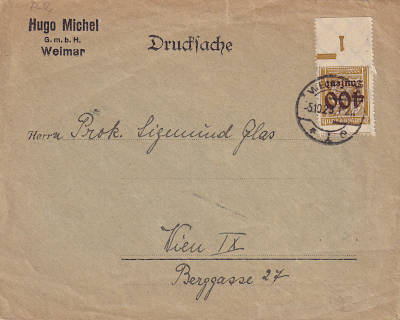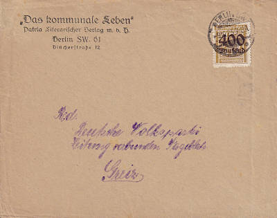Auslandsdrucksache (1-25 g) vom 05.10.1923 (19. Periode) frankiert mit einer Marke a 400 000 Mark auf 25 Pfennig (=400 000 Mark); nach Österreich galt der Inlandstarif |
