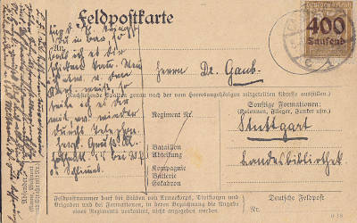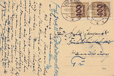 Ortspostkarte vom 05.10.1923 (19. Periode) frankiert mit einer Marke a 400 000 Mark auf 25 Pfennig (=400 000 Mark) |