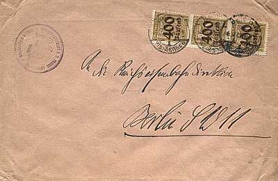 Ortsbrief (21-100 g) vom 06.10.1923 (19. Periode) frankiert mit 3 Marken a 400 000 Mark auf 25 Pfennig (=1,2 Millionen Mark) |