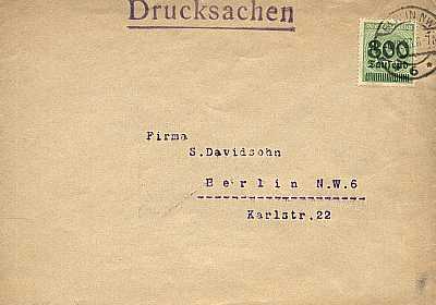 Inlandsdrucksache (26-50 g) vom 04.10.1923 (19. Periode) frankiert mit einer Marke a800 000 Mark auf 400 Mark (=800 000 Mark)