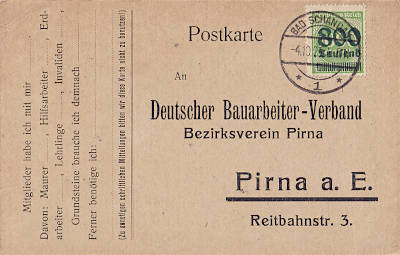 Inlandspostkarte vom 04.10.1923 (19. Periode) frankiert mit einer Marke a 800 000 Mark auf 1 000 Mark (=800 000 Mark)