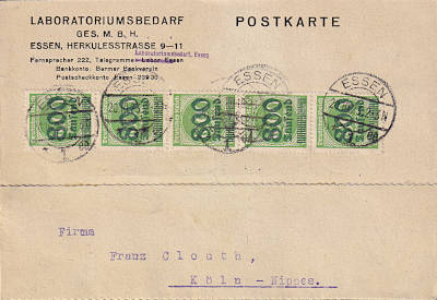 Inlandspostkarte vom 20.10.1923 (21. Periode) frankiert mit 5 Marken a 800 000 Mark auf 1 000 Mark (=4 Millionen Mark)