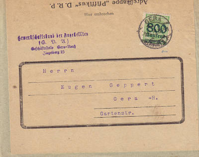 Ortsbrief (1-20 g) vom 02.10.1923 (19. Periode) frankiert mit einer Marke a 800 000 Mark auf 1 000 Mark (=800 000 Mark)