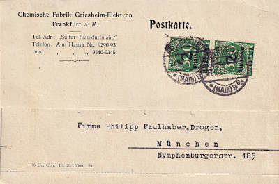 Inlandspostkarte vom 27.10.1923 (21. Periode) frankiert mit 2 Marken a 2 Millionen Mark auf 300 Mark (=4 Millionen Mark) |