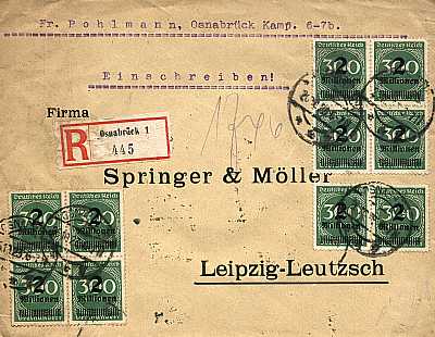 Inlandsbrief mit Einschreiben (1-20 g) vom 26.10.1923 (21. Periode) frankiert mit 10 Marken a 2 Millionen Mark auf 300 Mark (=20 Millionen Mark, 10 Millionen Brief 10 Millionen Einschreiben) |