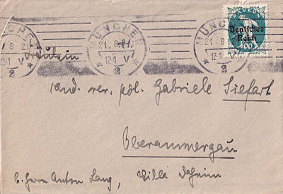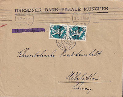 Auslandsbrief (1-20 g) vom 28.07.1921 (6. Periode) frankiert mit 2 Marken a 60 Pfennig (=1,20 Mark)