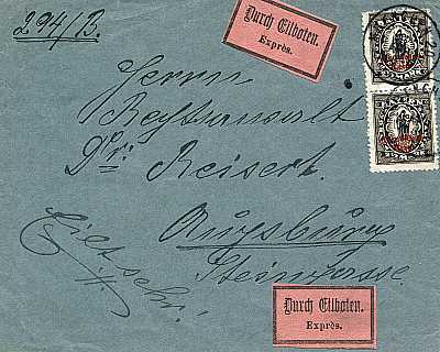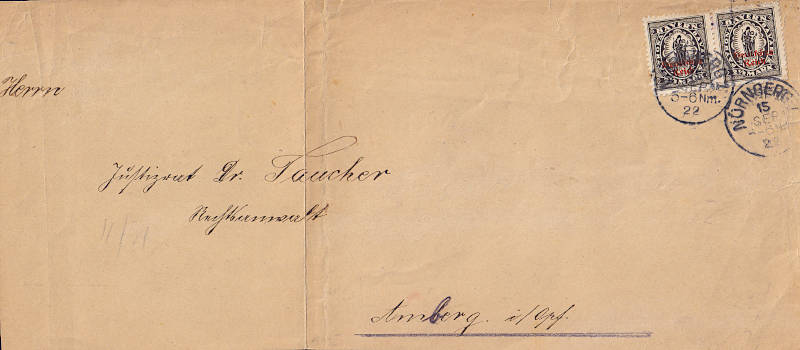 Inlandsbrief mit Eilzustellung (1-20 g) vom 22.04.1922 (7. Periode) frankiert mit 2 Marken a 2½ Mark (=5 Mark, 2 Brief 3 Eilzustellung) |