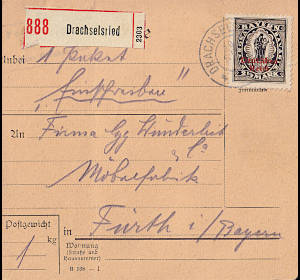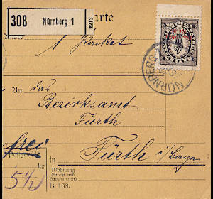 Inlandspaketkarte (5 500 g, < 75 km) vom 15.09.1920 (5. Periode) frankiert mit einer Marke a 2½ Mark (=2,50 Mark) |