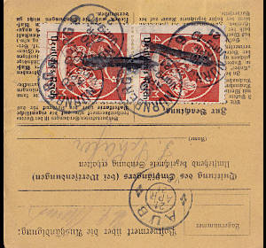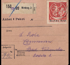 Inlandspaketkarte (7 500 g, > 75 km) vom 12.10.1920 (5. Periode) frankiert mit einer Marke a 4 Mark (=4 Mark)