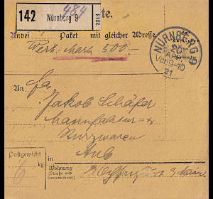 Inlandspaketkarte mit Wertangabe (500 Mark) (6 000 g, < 75 km) vom 20.04.1921 (6. Periode) frankiert mit 2 Marken a 4 Mark (=8 Mark, 6 Paket 2 Wert)