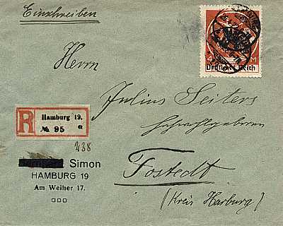 Inlandsbrief mit Einschreiben (1-20 g) vom 26.04.1922 (7. Periode) frankiert mit einer Marke a 4 Mark (=4 Mark, 2 Brief 2 Einschreiben)