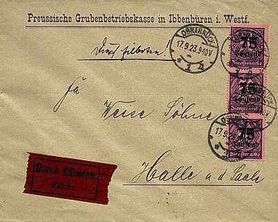 Inlandsbrief mit Eilzustellung (1-20 g) vom 17.09.1923 (17. Periode) frankiert mit 3 Marken a 75 000 Mark auf 50 Mark (=225 000 Mark, 75 000 Brief 150 000 Eilzustellung) |