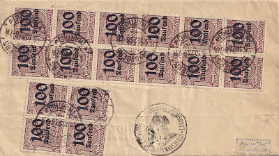 Inlandsbrief (1-20 g) vom 05.10.1923 (19. Periode) frankiert mit 20 Marken a 100 000 Mark auf 15 Pfennig (=2 Millionen Mark)