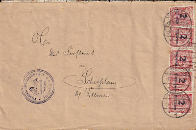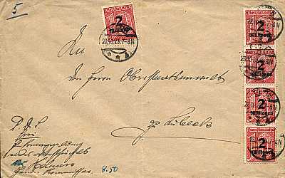 Inlandsbrief (1-20 g) vom 28.10.1923 (21. Periode) frankiert mit 5 Marken a 2 Millionen Mark auf 10 Pfennig (=10 Millionen Mark)