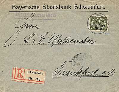 Inlandsbrief mit Einschreiben (1-20 g) vom 30.03.1921 (5. Periode) frankiert mit einer Marke a 90 Pfennig (=90 Pfennig, 40 Brief 50 Einschreiben) |