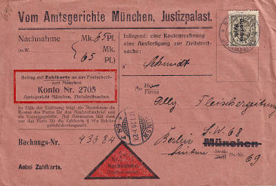 Inlandsbrief mit Nachnahme (1-20 g) vom 16.07.1920 (5. Periode) frankiert mit einer Marke a 90 Pfennig (=90 Pfennig, 40 Brief 50 Nachnahme) |