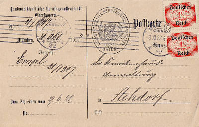 Inlandspostkarte vom 03.11.1922 (9. Periode) frankiert mit 2 Marken a 1½ Mark (=3 Mark)