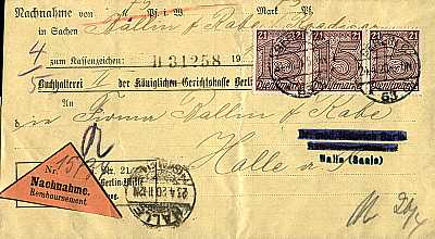 Inlandsbrief mit Nachnahme (1-20 g) vom 24.04.1920 (4. Periode) frankiert mit 3 Marken a 15 Pfennig (=45 Pfennig, 20 Brief 25 Nachnahme)