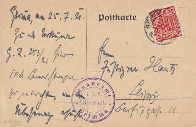 Inlandspostkarte vom 25.07.1921 (6. Periode) frankiert mit einer Marke a 40 Pfennig (=40 Pfennig) |