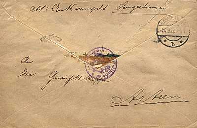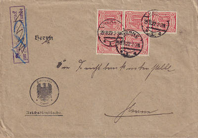 Inlandsbrief (1-20 g) vom 07.06.1922 (7. Periode) frankiert mit 5 Marken a 40 Pfennig (=2 Mark) |