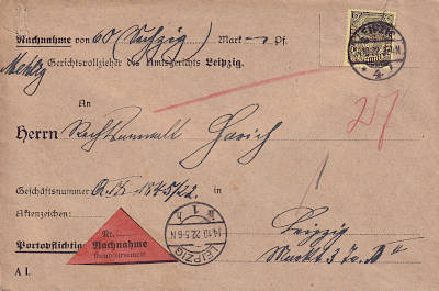 Ortsbrief mit Nachnahme (1-20 g) vom 14.10.1922 (9. Periode) frankiert mit einer Marke a 5 Mark (=5 Mark, 2 Brief 3 Nachnahme) |