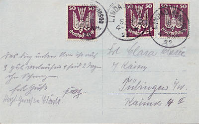 Inlandspostkarte vom 08.09.1922 (8. Periode) frankiert mit 3 Marken a 50 Pfennig
