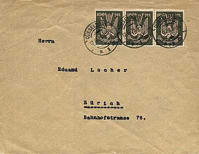 Auslandsbrief (1-20 g) vom 12.06.1923 (13. Periode) frankiert mit 3 Marken a 100 Mark (=300 Mark)