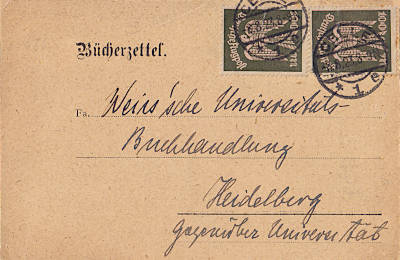 Inlandsbücherzettel (1-25 g) vom 08.08.1923 (15. Periode) frankiert mit 2 Marken a 100 Mark (=200 Mark)