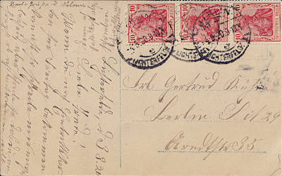 Ortspostkarte vom 04.08.1920 (5. Periode) frankiert mit 3 Marken a 10 Pfennig (=30 Pfennig) |