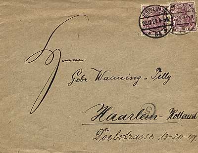 Auslandsbrief (1-20 g) vom 22.12.1921 (6. Periode) frankiert mit 2 Marken a 60 Pfennig (=1,20 Mark) |