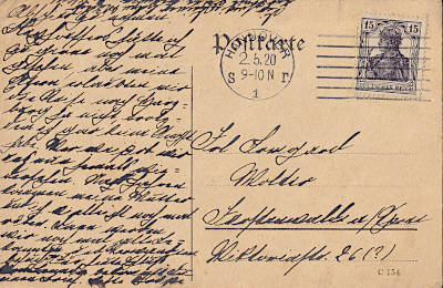 Auslandspostkarte vom 06.04.1920 (4. Periode) frankiert mit einer Marke a 15 Pfennig (=15 Pfennig); nach Österreich galt der Inlandstarif |