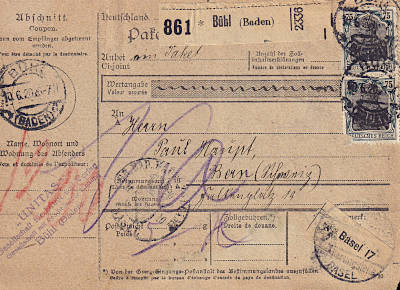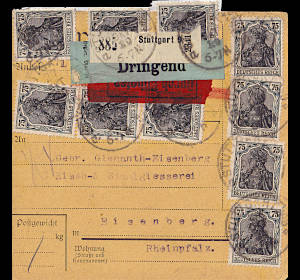 Auslandspaketkarte (5 000 g) vom 10.06.1920 (5. Periode) frankiert mit 16 Marken a 75 Pfennig (=12 Mark) |