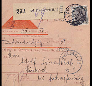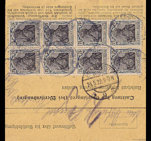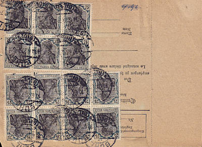 Inlandspaketkarte (2 500 g, > 75 km) vom 23.05.1922 (7. Periode) frankiert mit 12 Marken a 75 Pfennig (=9 Mark) |