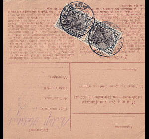 Inlandspaketkarte mit Nachnahme (5 000 g, > 75 km) vom 26.11.1919 (4. Periode) frankiert mit 2 Marken a 75 Pfennig (=1,50 Mark, 1,25 Paket 0,25 Nachnahme) |