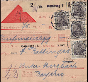 Inlandspaketkarte mit Nachnahme (2 500 g, > 75 km) vom 30.08.1920 (5. Periode) frankiert mit 4 Marken a 75 Pfennig (=3 Mark, 2 Paket 1 Nachnahme) |