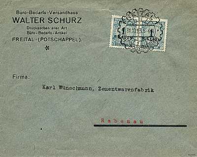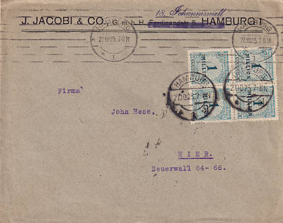 Ortsbrief (1-20 g) vom 27.10.1923 (21. Periode) frankiert mit 4 Marken a 1 Million Mark (=4 Millionen Mark) |