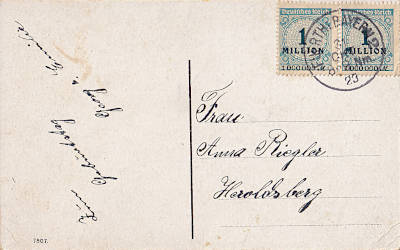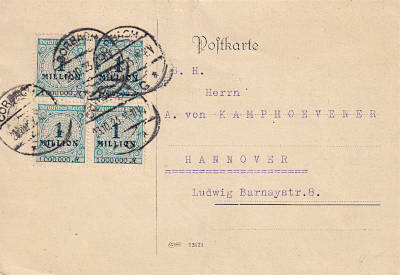 Inlandspostkarte vom 23.10.1923 (21. Periode) frankiert mit 4 Marken a 1 Million Mark (=4 Millionen Mark) |