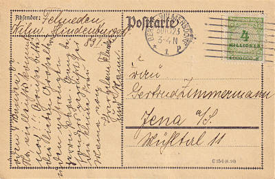 Inlandspostkarte vom 30.10.1923 (21. Periode) frankiert mit einer Marke a 4 Millionen Mark (=4 Millionen Mark) |