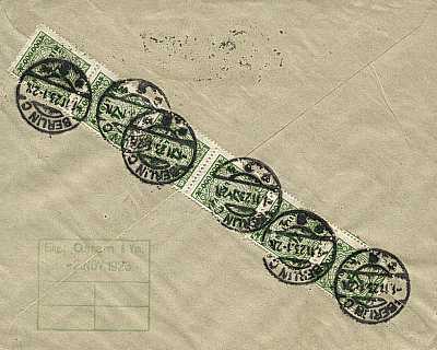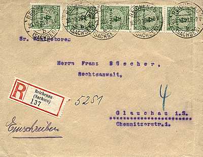 Inlandsbrief mit Einschreiben (1-20 g) vom 30.10.1923 (21. Periode) frankiert mit 5 Marken a 4 Millionen Mark (=20 Millionen Mark, 10 Millionen Brief 10 Millionen Einschreiben) |