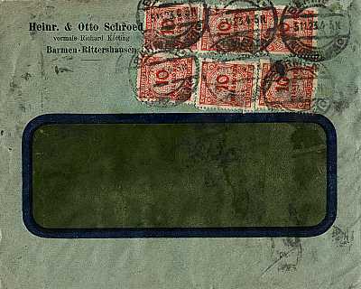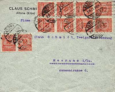Inlandsbrief (1-20 g) vom 02.11.1923 (22. Periode) frankiert mit 10 Marken a 10 Millionen Mark (=100 Millionen Mark) |