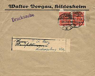 Inlandsdrucksache (1-25 g) vom 03.11.1923 (22. Periode) frankiert mit 2 Marken a 10 Millionen Mark (=20 Millionen Mark) |