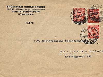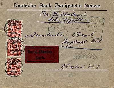 Inlandsbrief mit Eilzustellung (1-20 g) vom 24.10.1923 (21. Periode) frankiert mit 3 Marken a 10 Millionen Mark (=30 Millionen Mark, 10 Millionen Brief 20 Millionen Eilzustellung) |